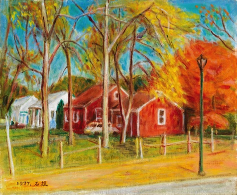 70年代至90年代,李石樵開始由抽象回歸到寫實主義,吸收了波納爾與塞尚的風格,表現出高彩度明亮之美。此幅《美國風景》為此時期經典風格。意境寫實、色彩明亮,在客觀理性的景致中融入主觀感性的色調,是相當出色細膩的寫實作品。