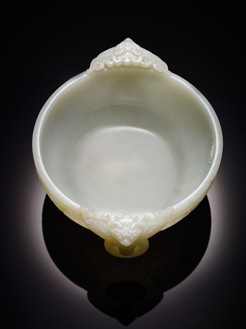 類似器:北京故宮博物院藏有一件清乾隆〈和闐玉蝠蓮紋獸耳活環洗〉,造型與本拍品雷同,詳見:李久芳主編,《中國玉器全集‧6‧清》,台北:錦繡出版事業,1994年,頁215。