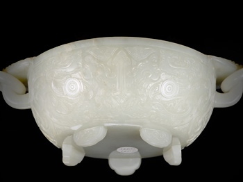 整料和闐白玉雕成,器型碩大。洗圓口,弧腹,腹下漸收,瓶底,下承五雲葉式矮足。腹壁兩側鏤雕蝙蝠.尾活環為雙耳.,腹壁以減地技法,淺浮雕構圖複雜的獸面紋,獸面紋複眼,眼眶兩端收尖,儘管是模擬青銅鼎彝上的神祕紋樣,卻有十八世紀復古風潮下的典型風格。是件五足洗耗料費工,選用大料一氣呵成,又雕工講究細微精緻表現,誠然是乾隆時期不可多得的頂級玉雕陳設。