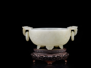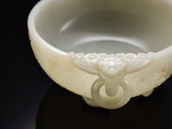 清乾隆 白玉獸面紋蝠耳活環五足洗