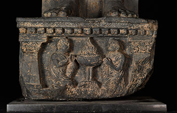 这件来自日本私人珍藏的佛陀站相,是一件非常稀有的犍陀罗艺术精品,从艺术风格和雕刻手法来看,应该出自公元二世纪晚期,正是犍陀罗艺术的高峰年代,不但尺寸罕见,而且雕工精湛,属于博物馆级别的藏品,尤其底座上雕刻的双弟子像,极为精致细腻,可以联想到北魏时期造像的风格,可见犍陀罗对中国佛教造像艺术深远影响。