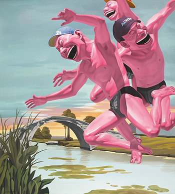 從2004年開始,從雅典奧運會上,得獎的運動員頭上的橄欖頭冠,岳敏君思考到帽子之於身分、社會地位、國籍、種族的表述,具有重要的象徵意義。他在笑臉人物上添加「帽子」的元素,進入了所謂的「帽子系列」,探討人的身分與職業,及其與社會環境的關連性,顯見岳敏君對於社經議題的持續關注。此幅拍品《故鄉》作於2005年,也屬於「帽子系列」的創作之一。初看《故鄉》畫作的背景,自然聯想到已故畫家陳逸飛的1984年成名作《故鄉的回憶》,該畫取景自江南水鄉周庄,美國企業家購進此畫後來轉贈與鄧小平,從此陳逸飛的石拱橋圖像成為江南水鄉的標誌,甚至是懷舊中國的樣版印象。