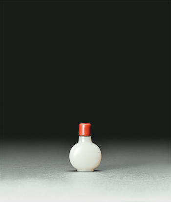 整料和阗玉雕成,呈扁瓶形,直口,短颈,丰肩,扁圆腹,腹下渐收,下承圈足。通体光素,不施任何纹样,既展现凝润晶莹的白皙玉质,同时也形塑出简约柔美的线条曲度。上配圜顶高柱形红珊瑚盖连匙。
