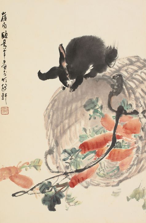 《兔》以墨兔據於籐籃之上,欲得食物之態。畫家先以重墨寫繪墨兔之神韻,趁濃淡乾濕之際寫出兔毫蒼潤之感,墨兔前肢居前欲試待發,後肢輕提,其勢若徐徐而欲動。目視斜下之處,寫繪翻倒之籐籃,紅蘿蔔灑落其間。兔子的繁殖力很強,又有多子多孫之寓意;而蘿蔔在漢語裡又稱作「采頭」,所以有吉利的意思。而紅色又是大喜之色,所以紅蘿蔔的意義是喜上加喜,非常吉利。