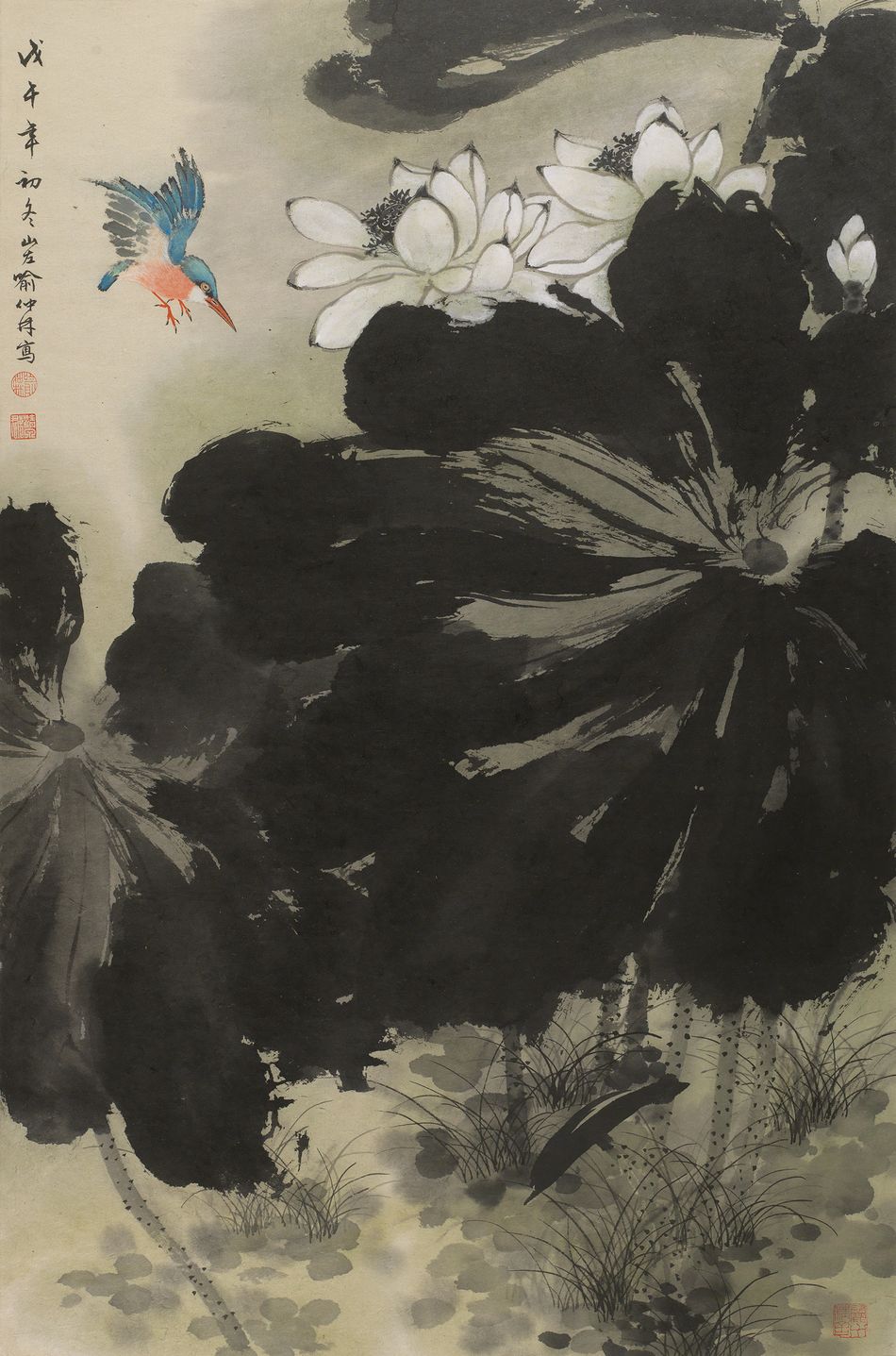 喻仲林的工筆花鳥畫深受張大千青睞,喻氏後期遷居雲河大廈,與當時歸臺的張大千比鄰而居,兩人結為忘年之交,大千肯定喻仲林能堅持傳統工筆花鳥一脈,常予以私藏的古畫臨摹,可知大千惜才之心。《荷塘情趣》通幅運筆生風,兼有徐渭大寫意墨荷畫意與張大千破墨筆意;水墨寫荷先描荷莖,喻仲林以中鋒淡墨直取,施以墨苔作微刺,佔據圖面的荷葉則先取中心圓點,後以健毫散鋒掃出、濃墨點厾一揮而就,濃墨淡墨施用,既能得形似又有神和;荷花以雙鉤圈瓣,敷以胡粉作出白荷清癯風貌,荷蕊蓮蓬則用細筆流水線法施墨寫就,其精緻程度令人歎為觀止;荷塘上飛舞著一隻紅腹青背鳥,喻仲林以枯筆皴擦、兼用墨色與花青刷出振飛的翅羽,朱磦敷染鳥腹,細筆鉤勒鳥喙與勾爪;荷塘水草以長鋒清掃交鳳眼,細密有致,其中醒眼之處在於以破筆掃撇出水草叢中抽長、尚未舒展的荷葉,讓看似閑淡的風景帶有瀟灑之意,實為喻仲林少見、清新奇巧的大寫意名作。