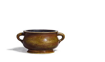通體精銅鑄造,圓口平唇,束頸溜肩,肩兩側出線條凝鍊的蚰龍為耳.。廣圓腹,腹下漸收,下承外撇寬圈足,底署方框「大明宣德年製」三行六字楷書陽文款。是器底部外露金黃色澤的優美銅質,外壁滿罩棗紅色皮,唯皮色因年代斑剝之故,更顯光影搖曳的流動氣息,予人無限遐想!