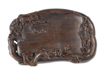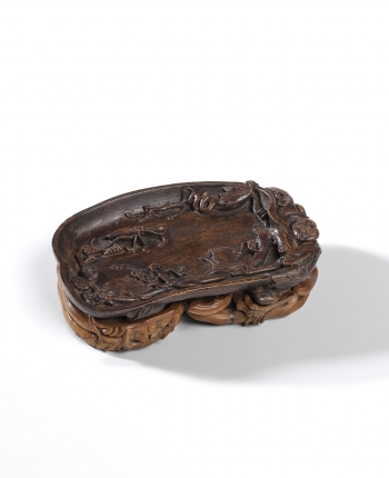Lightly-hollowed and worked as a leaf with incurring edges, the exterior with shallow-relief veining issuing from a stem with further leafy greens and blossoming florets and pods, all extending to the underside in high relief, the interior with an insect clambering up towards the stem, the stand of buff caramel tone rendered in the form a gnarled branch.