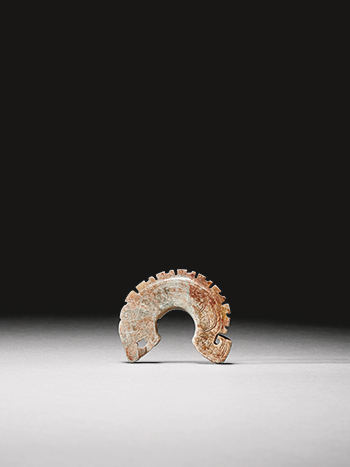 玉質鈣化,滿布生坑沁斑。通體呈三分之二圓形板片狀,做一弓軀的行龍貌,兩面雕工。是龍背脊出扉棱,尾部向外翻捲,臣目眼,身軀以雙勾技法雕飾變形勾連雲紋,嘴部鎪出芒星狀圓口,似有畫龍點睛之效。全器線條疏朗流暢,流露濃郁的殷商玉雕藝術風格。