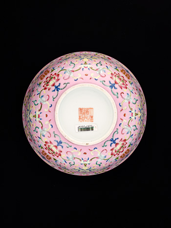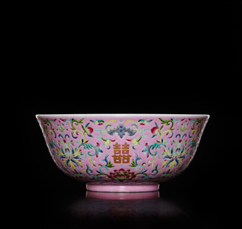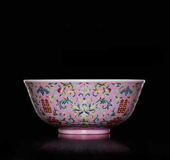 碗甚大,侈口,深弧腹,腹下漸收,圈足。碗內與足底施透明白釉,外壁罩粉紅色地,復以諸色粉彩飾勾繞有桃葉、蝙蝠與寶相花的四方連續纏枝花卉紋。惟兩兩寶相花的留白處因明顯嵌有囍字,故知「多福、多子、多壽」的吉祥寓意之外,實為是專為光緒皇帝大婚訂燒的官樣御瓷,底書紅彩「大清道光年製」三行六字篆書款。