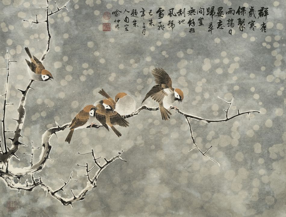 釋文:群雀歲寒保聚,兩鶉日晏忘歸。草間豈無餘粒,刮地風號雪飛。