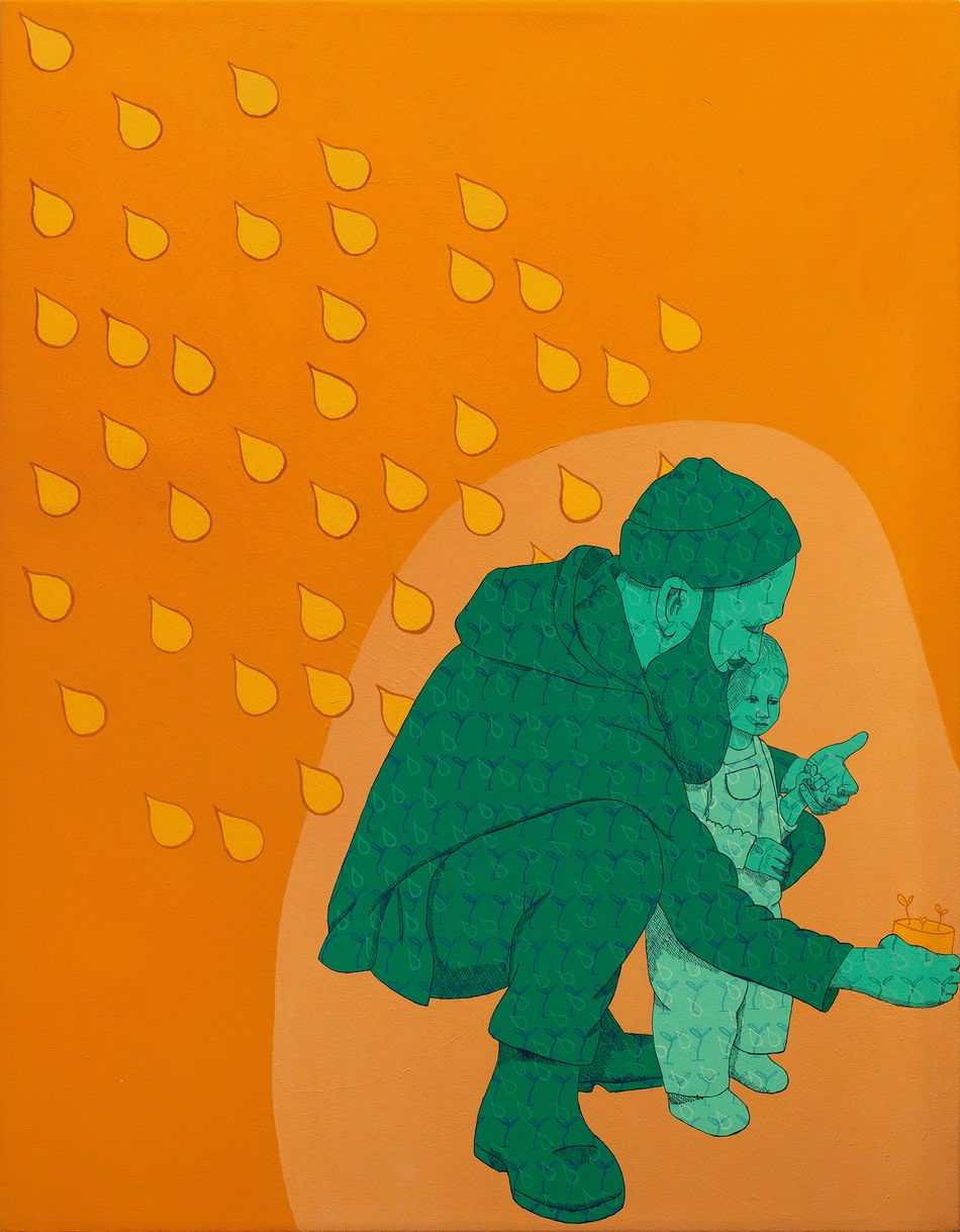 藝術家透過簡單的線條輔以個性化的圖案,紀錄下身邊人物的生動性格與故事。《循循善誘》系列作以「之間」為題,藝術家首度將主題聚焦於「關係」的探索,透過家人、情人與寵物和主人之間的溫馨互動描繪出情感的牽絆。波兒的畫筆不僅僅記錄下溫暖、舒適的氛圍,也繪出最真摯的剎那。