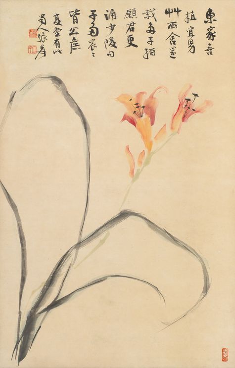 《萱花圖》即是張大千早年取揚州八怪畫家之一李鱓(字復堂)所作「東家喜植宜男草,西舍還栽多子榴。願君更頌少陵句,子多袞袞皆公侯。」詩句,並模仿其畫風繪製的一幅花卉佳作。從簽款「蜀人張爰」的書風以及畫上「張爰之印」、「大千」、「大千好夢」三方鈐印,大致可以推斷此乃大千1930年代前期的創作。畫面中,只見一株折枝萱花自左下角斜出,大千先以花青和墨快速畫出飄逸的長葉,筆法縱逸,寥寥數筆便已風神振發;然後於枝椏末端再用藤黃及赭紅以沒骨法畫出萱花由含苞待開到盛放的情態,每朵花各有其形狀和韻致,花瓣飽滿帶有凹凸效果,並且呈現輕薄半透明的質感,最後大千再以鋒穎俊發的點畫來畫花蕊,為這幅清麗淡雅的小品畫龍點睛,工筆處一絲不苟,寫意處則揮灑自如,充份體現大千寫意花卉藝術的超絕水準。