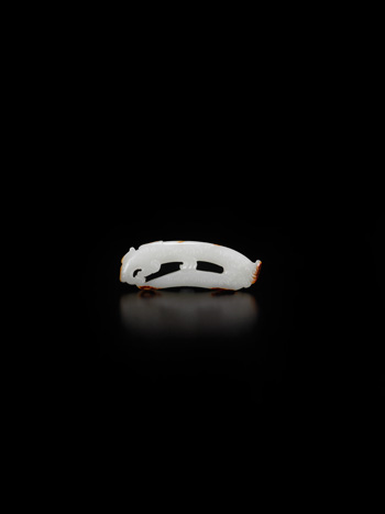 Worked in the form of an archaic dragon with its coiled inward, finely incised pointed ears above the mouth rendered in openwork, the body with c-scrolls and spirals, retaining small areas of russet skin near the extremities of the tail.