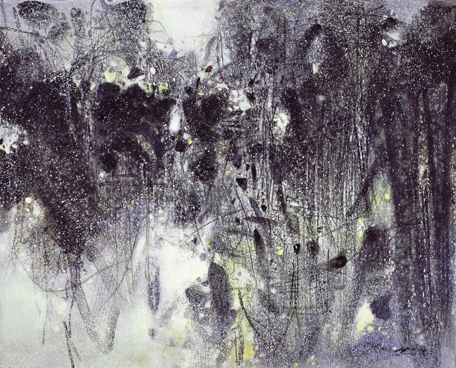 《詩意之冬》作品的確是飽含詩意,帶有唯美的意境,如同演奏一首即興的樂章。畫家將冬賞寒林景致描寫得細膩,行草般錯落的線條,充滿速度感,佔據畫面中央,如夜幕倏地垂落。驀然間霜雪飛撒,如串串珍珠抖落,輕快悠揚,灰暗的簾幕裡彷彿降下熠熠星光,映出大地雪白顏色。幽幽的淡黃色,為寒色雪景增添些許溫情。吳冠中認為,朱德群的雪景其實反映了自身的生命體驗,他寫道:「畫家任性揮灑,繪出了繁雜多樣、虛實夢幻、喜怒奔放......,這一切均係人生經歷中所積澱的哀怨與幸運,一朝衝破內心深處的幕紗,展示出作者漫長藝術生涯的軌跡與烙印。」(參閱祖慰著《朱德群傳》,霍克國際藝術,台北,2003年8月1日首版,頁 225─226)