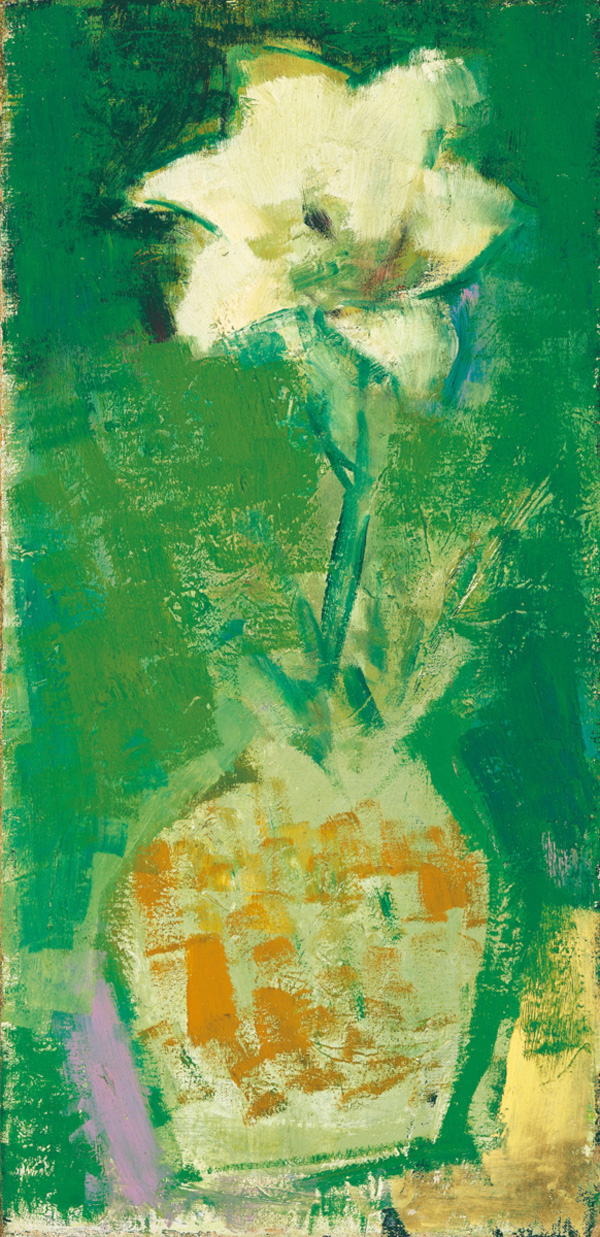「以墨綠及藍色的調子為背景,襯托百合花清幽雅潔的白色光采,鮮活的孔雀藍代替花的陰影,提昇畫面的鮮麗和活潑感。紫褐色的輪廓線條不經意的規範出花形,在閃爍的色彩中烘出花的實質存在。」(目錄,頁11)