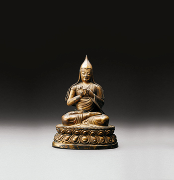 通体以捶鍱技法打制,薄胎体轻。头戴黄教的通人冠,冠耳垂肩。身着僧袍,衣襬錾饰卷草纹,衣褶流畅自然,两肩原有托花(已失),双手当胸结说法印,全跏趺坐,下承仰覆莲座。 是件坐像工艺精湛,技法娴熟,法相祥和慈悲,为藏传佛教格鲁派的典型造像。