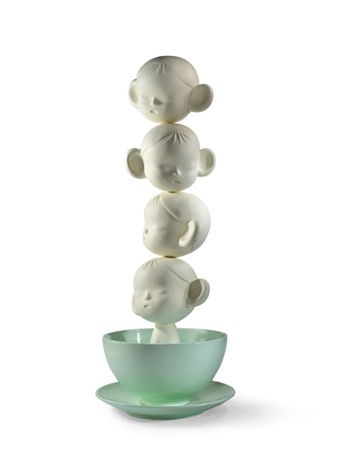 1995年奈良美智首次在東京展覽發表一件大型小狗雕塑,逐漸創作更多以玻璃纖維FRP為媒材,將畫裡的小孩與動物,轉換成雕塑作品,大受好評。《Quiet, Quiet》以四顆大頭娃娃為主題,看似孩子亦也像小猴子,於咖啡杯中堆疊起來。奈良美智的娃娃們一向反映出藝術家心境與生命歷程,雙眼緊閉,沉吟忖度,帶給觀者極大的想像空間。此件美術館級裝置雕塑作品《Quiet, Quiet》高245公分創作於1999年,以獨特的粉色調營造出充滿幻想且迷人的迷幻空間。