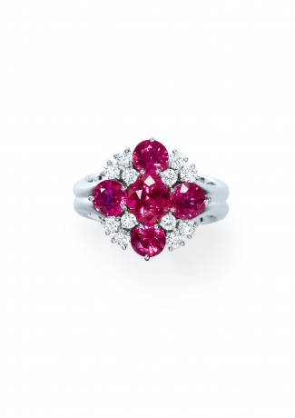 Centering upon an oval-cut ruby weighing approximately 1.00 carat, held by four prongs each set with a brilliant-cut diamond, in a circular-cut ruby quatrefoil surround weighing a total of approximately 2.12 carats, enhanced by brilliant-cut diamond two-stone spacers, to a triangular-shaped twin band, mounted in platinum and 18k gold, ring size 6