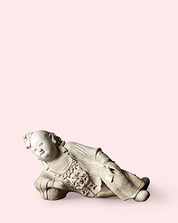 宋代時期娃娃瓷塑像,除了有祈佑婦人生育男嬰外,更有和諧、吉祥、辟邪的寓意。這件屬於案頭清供的瓷娃娃擺件,藝術感強烈,器形碩大,是目前已知該類型器物中最大者,此素胎娃娃擺件,原有彩繪,歷經歲月的侵蝕已脫落。塑像胎質潔白細膩,整體工藝構思縝密,孩童容貌天真,髮髻系飄帶,眼有神,福鼻小嘴,大耳下垂,胸前配帶珠玉瓔珞,手帶環,側身倚靠球體,呈休憩姿態。在衣著上;內肚兜,外長袖短衫,穿開襠長褲,腳踏一布鞋,私密處可見男娃兒特徵。最後在工藝上;不同於北方窯口製作的瓷俑,大多采合模接合,姿態也以俯臥為主,景德鎮窯則多以手捏和線刻的方式分段接合處理,這種類似立體面塑的新技法,尤其在雕塑人物體態,衣著,面部表情上,表現更的為生動自然。