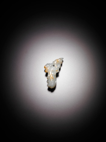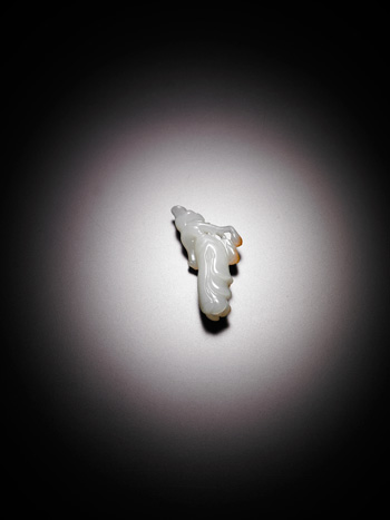 白玉雕成,局部有褐色斑,通體作並蒂玉蘭花株貌。枝梗下垂覆一朵玉蘭花,頂端有含苞待放小花苞,玉蘭花馥郁清香,經常與牡丹和為玉堂富貴,然則玉蘭花單獨意象,或有「吉祥美好」的清妙寓意。