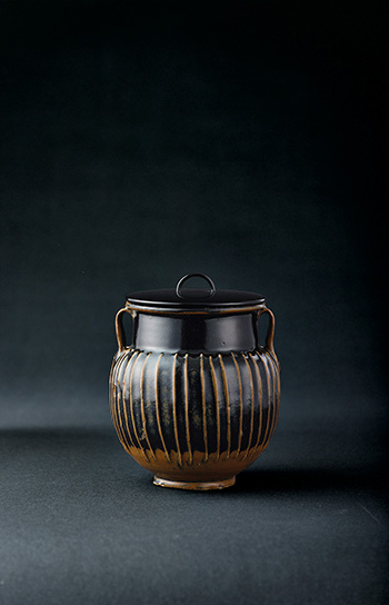 罐唇口,弧腹,肩部飾雙耳。器身施黑釉,裝飾有線條紋;黑釉線條罐是磁州窯系的代表作。其製作方法是在半乾的胎體上先刻出棱線,形成有韻律的線條起伏,再施以黑釉,由於釉料在高溫下的自然流動,使得黑釉隨著棱線的起伏呈現濃淡黑白的對比,起到以線條裝飾器身的效果,展現其渾樸質感與北方窯口瓷器的豪邁性格。