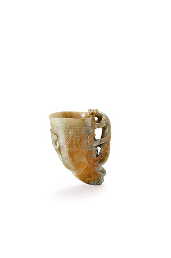 Carved from a single piece of Nephrite, parts contain a brown matte coloration with several naturally formed tress lines. The entire piece is made in the shape of a libation cup with a slightly curved body, wide at the top and narrow at the bottom. The inside wall of the cup has been polished to a fine finish whilst the outer wall is decorated with intricate patterns which are set out, from top to bottom, as follows. Near the lip are two consecutive lightning patterns and under these are a two tumbleweeds. On the midsection walls, two protruding lines serve as to separate a section of broad strap patterns. The insides of the broad strap patterns are decorated with wispy cloud patterns using embossing. The bottom of the mid-inner wall is given a lively fresh cloud image. Near the bottom of the cone is embossed a fire cloud decoration. On one wall of the libation cup there is an embossing of a dragon clinging to the side. On the other side, created with an openwork sculpting technique, another dragon clings to the wall with its head turned. Requiring a large amount of material and craftsmanship, the carving is classically elegant. It is a fine piece Ming Dynasty work imitating the Han Dynasty style jade libation cups.