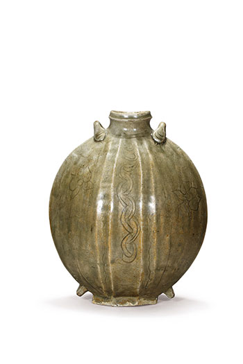 壺小口,短頸,鼓腹,壺身為八棱形,肩部與接近圈足處各有系耳兩只,棱線凸起明顯,清晰的將壺身分數部分,壺身刻畫有花卉紋飾,線條簡單,追求寫意的效果,亦有曲線條組成的繩索狀紋飾貫穿壺體上下。圈足處不施釉,露出黃褐色胎骨。此壺應為古人的承裝液體的實用之器,兩端的系可穿帶繩索,便於攜帶。此壺雖經歷千年之久,保存依然完好,傳遞出古人對精緻生活的追求。