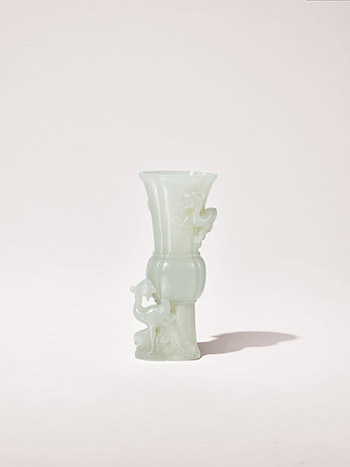 整料和闐原石雕成,玉質甚佳。橢圓形口,平唇,頸以下漸收,瓜形圓鼓腹,下承高圈足,圈足至底部微外撇。腹壁上下各起一圈凸弦紋,通身正反面各飾兩道縱向凹棱線。頸壁一側以剔地技法高浮雕一螭龍,底部一端透雕半立體的回首立鳳,螭鳳一上一下遙相呼應,似在典雅的花觚器形外,增添風姿綽約的旖旎氣息。