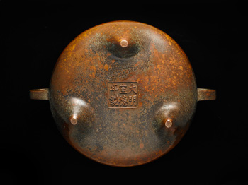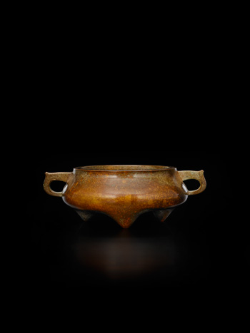 爐廣口平唇,短頸,溜肩,垂腹,腹下承三乳足,腹壁兩側起.耳。通體光素,皮色金光內含,曼妙可愛。底部中央減地四方框,內署陽文「大明宣德年製」三行六字楷書款。