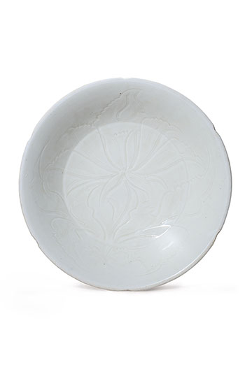 定窯為宋代五大名窯之一,以白瓷聞名於世,此件定窯牡丹花卉紋折腰花口盤胎體輕薄,釉色潔白純淨,宋代定窯白釉的上流釉色。碗口呈花形,碗心刻畫折枝牡丹花,一朵牡丹花充滿整個盤心,其刻畫刀法嫺熟,行雲流水,質地堅實,色澤瑩潤,為北宋定窯瓷器中路份較高的一件。