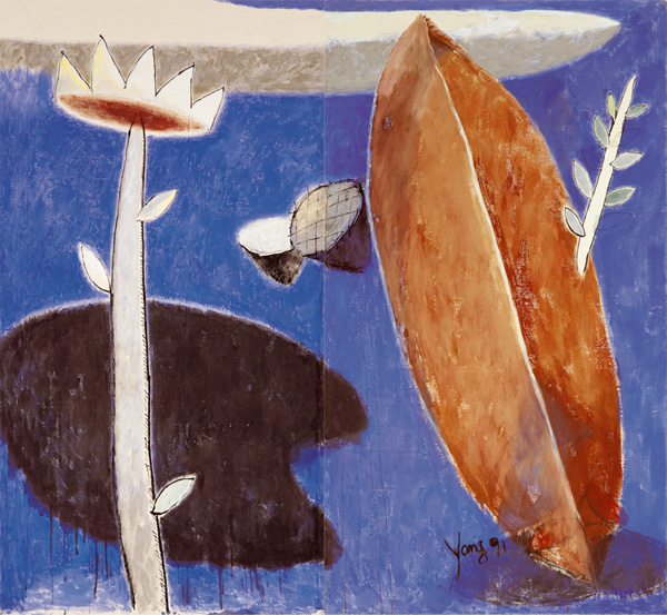 The "Lotus" was finished in 1991; Yang used blue as the main color in this picture, simplified lotus and other objects forms a special kind of beauty. And this kind of style is decorative, the color blocks and contrasts strengthened that kind of feeling, further restores the art itself; the "Lotus" could be one of Yang's best representative works.