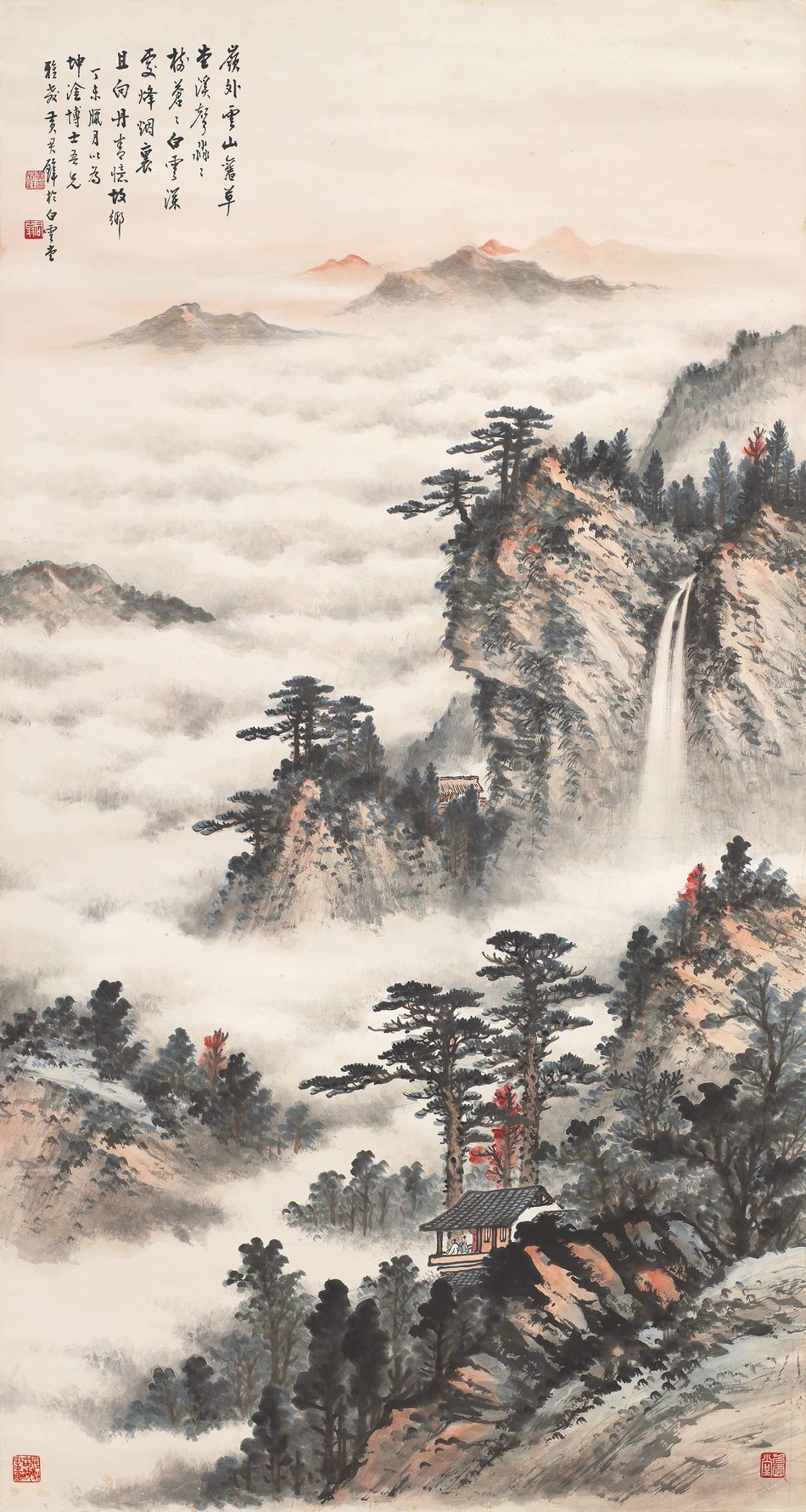 Huang Chun-pi was trained under Li Yao of the Lingnan School to practise western paintings, followed by traditional Chinese ink paintings. Landscape works are well sought after, especially those of waterfalls and misty landscapes. Both Chinese and Western painting techniques are superbly incorporated in this work. Swift strokes were applied with confidence. Three layers of structures could be found in this work with a sketch of mountains in the middle ground. Lofty cliffs and rugged hills create a balance of fragility and sturdiness. Short cun and dots were added to the cliff highlighted with soft layers of ink and ochres, depicting the texture of rocks. A myriad of skills was used to depict the forest by saturated dots of ink and red, highlighting an autumnal scene. Two cliffs open up to a waterfall depicted with shaking strokes and v-shaped lines. As water falls, it merges with the misty clouds gleaming with grandeur. Dark outlines and light ochre were used for the distant hills, while light gray was used to depict the shadow of distant clouds. Such light depiction forms a refreshing scenery. A house hides among the clouds in a utopian mountainous surrounding. Inside the house sit two scholars appreciating the scenery, forming a secluded and relaxing scene. By the depiction of misty waterfall landscape, the artist hinted at his wish for tranquility.
