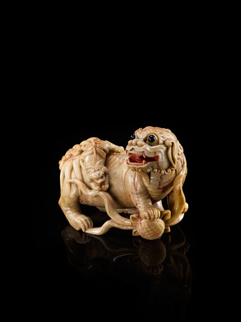 整料壽石山雕成,主體精雕一立獅,立獅側首前視,雙眼炯炯, 寬鼻垂耳,張口露齒,情態憨萌。頸背浮雕數綹捲鬣,前肢一腳 踏彩帶,一腳踩繡球,後肢屈膝弓立。背脊上攀伏的幼獅作向下 探試貌。全器勾勒生動,透過成獅與幼獅的肢體互動,表現出歡 樂的喜慶氛圍,是一件藝術造詣頗高的齋閣陳設。