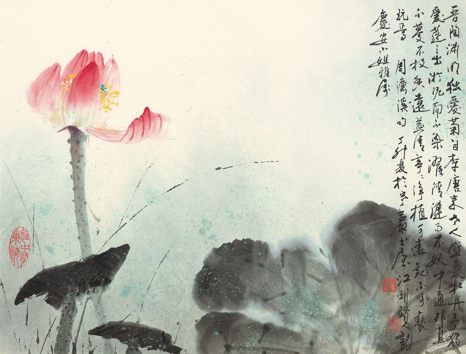 釋文:晉陶淵明獨愛菊,自李唐來世人盛愛牡丹,予獨愛蓮之出淤泥而不染,濯清漣而不妖。中通外直,不蔓不枝,香遠益清,亭亭淨植。可遠觀不可褻玩焉。周濂溪句。