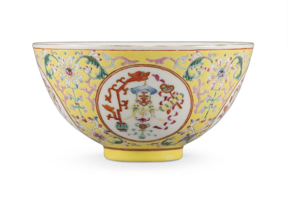 19世紀 黃地粉彩開光五穀豐登圖盌《慎德堂製》仿款