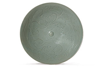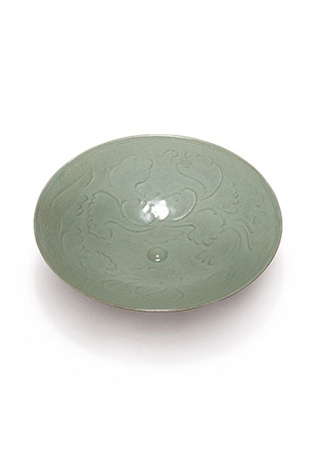 盤弧壁,至圈足漸斂,小圈足。全身施淡綠釉,淡綠釉色如湖水藍,盤心先用刀陰刻牡丹紋輪廓,在用篦刀刻畫花卉的經絡,釉水積於刀痕處,自然形成深色線條,釉光澄淨,刀法嫺熟,雖紋飾線條簡潔,仍可顯牡丹的雍容華貴。口沿外壁雕刻有兩圈旋紋,旋紋中簡筆刻畫如意雲紋環繞盤口一圈。此盤製作工藝極其講究,器形周正,或為模仿唐代金銀器物,展現出宋人對古人的追求與崇拜,為宋代越窯瓷器中一件值得收藏的珍品。