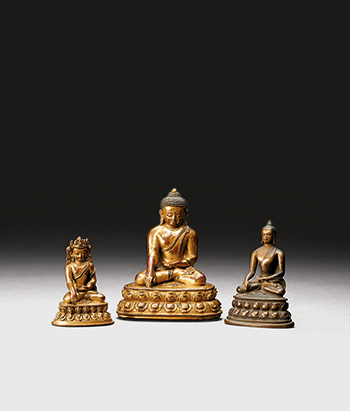 释迦牟尼佛三件,造像仪轨基本雷同,惟法相、衣纹略有差异。佛螺发或戴宝冠,面相庄严,身着袒右肩袈裟,衣褶起伏自然或做贴体表现。右手结触地印;左手施禅定印,全跏趺坐,下承仰复莲座。鎏金装饰者为藏传造像,而未鎏金(右)则为印度帕拉王朝的造像。作品风格同中有异,从而也体现出各地区佛教造像的丰富多元。