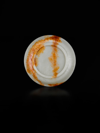 The shallow dish is carved rising to a flaring rim supported on a short straight foot, finely incised on the wells of the interior with c scrolls, the center with an egret flying upon the boundless sky looking in the direction of two egrets swimming in the quiet pond and one standing near the shore, finely incised with a florets on the recessed base and keyfrets encircling the base of the footrim, the stone with strikes of russet inclusions. D: 17 c m