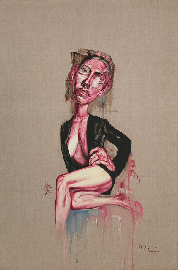 The picture is almost masculine in its rendition, a tribute to the inner strength and fortitude of the female protagonist, traits usually missing from Zeng's male figures. The woman seems at ease with her womanhood, sparingly dressed, exposing her femininity. This is also in great contrast to Zeng's male protagonists who are usually buttoned up, wearing long overcoats as if fearing exposure. The fragility and sadness of the male portraits is missing here, as the redemptive qualities of the female dominate.