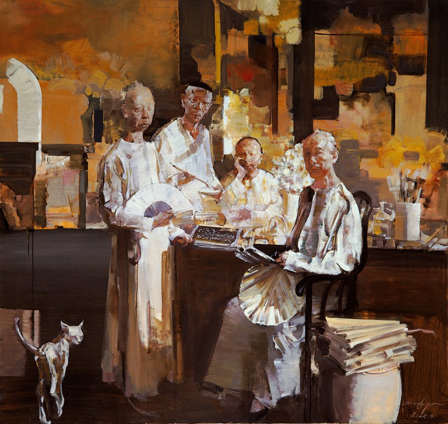 應該說這件作品,是我這個題材的封筆之作。我曾三度作此題材:一次是八十年代中,後我赴英國留學隨身帶往,留在了英國被某氏私人收藏,估計這件作品如還在一定被損嚴重。第二次是九十年代末,我照原件印刷品重新臨摹了一幅。而這第三次我是再度創作,對原件進行了很多修改。首先我是把原件的透視改成比較平面的透視、人物的前後也比較接近,其二是暫背景改動(包括桌面上的靜物),其三對原件中四位畫家的面部造型基本完全改掉。可以說這件作品不僅僅是我《我輕輕地敲門》的重畫,而是再度創作。