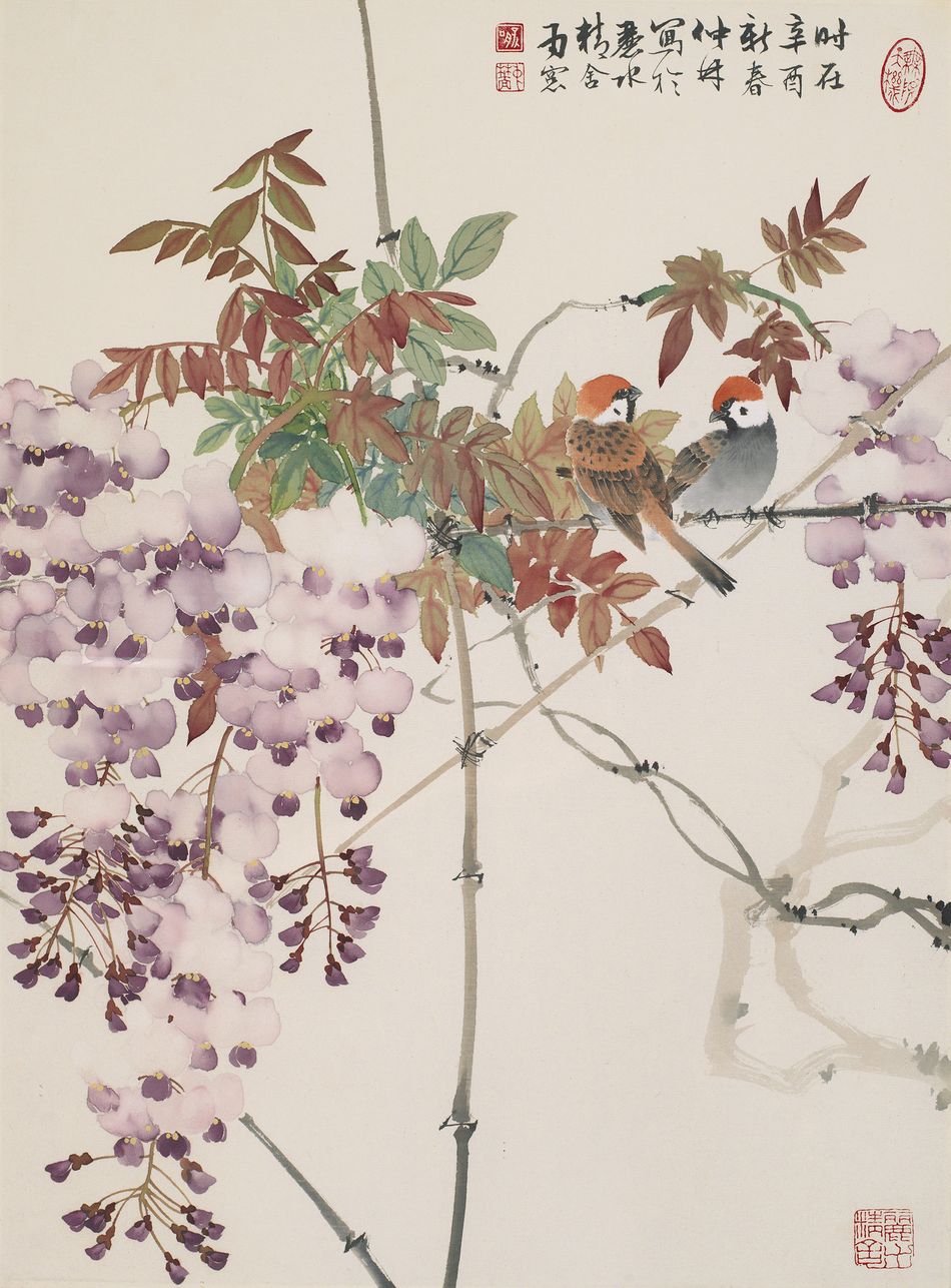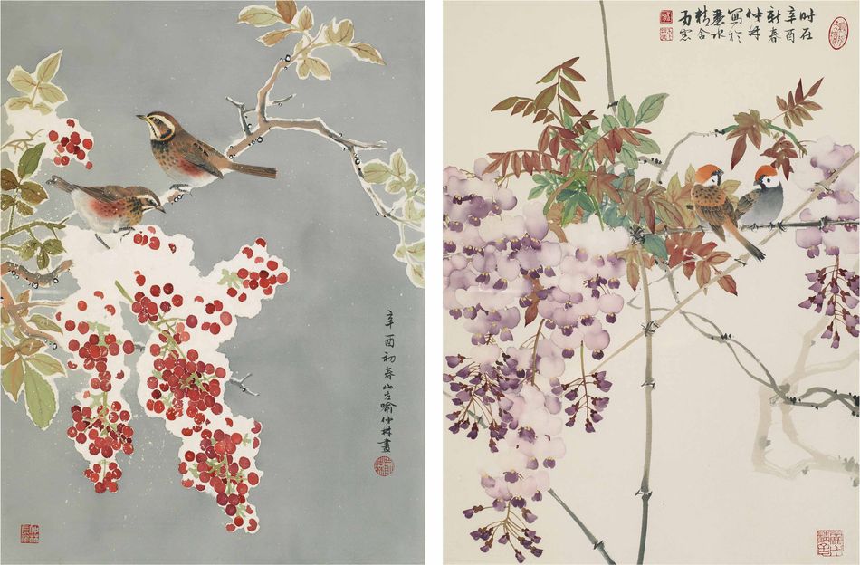 Larks Perching on Heavenly Bamboo and Sparrows and Wisteria (A Set of Two)
