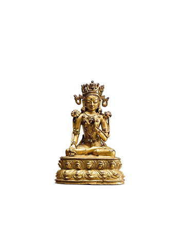 銅鎏金坐像,頭戴三葉寶冠,冠葉嵌各式寶石,束高髻。修眉善目,兩眉間現白毫,大耳垂璫,神情祥和肅穆。上半身裸露,肩托蓮花,胸垂華麗瓔珞,兩臂戴釧,左臂屈肘當胸,右臂自然垂放,掌心向上輕置膝蓋之上。下半身著貼身長裙,全跏趺坐,下承仰覆蓮座。是件菩薩所戴寶冠冠葉特殊,法相莊嚴,金水滋美,是元代造像中品項出眾的精品。