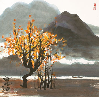 Shiy De-jinn looks at landscape through a modern eye, though in presenting it he gives it an entirely new form. He throws off wonted notions and habits, instead using nature to feel the entirety of the world. This work shows again Shiy's concern for the soil, as two boats are set against the pleasing scenery and the hardy yellow autumn trees in the foreground. Taiwan's rich beautiful landscape is figured wonderfully in Shiy's painting; his use of color is brilliant, and his composition is forcefully set.