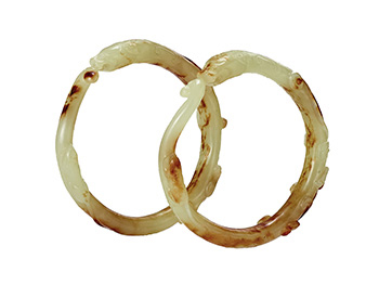 精選頂級和闐黃玉,玉色凝純,局部有褐色斑。玉鐲的主體做一首尾相銜的環形螭龍,螭龍身軀肥瘦合宜,曲線優美,近尾端並浮雕一尾錢鼠,形成典型的「子辰」題材。根據紋樣寓意顯示,鼠在中國傳統生肖與十二干支的組合排序為「子」,而龍則為「辰」,因此兩相結合即有「子辰」的意象,漢代的子辰珮被賦予保佑平安的表徵,爾後延續至明清時期,子辰則有望子成龍的吉祥寓意。