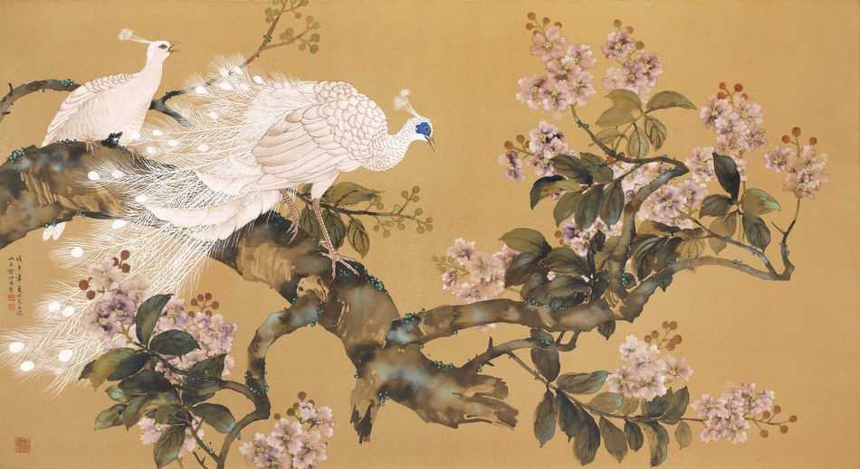 古今名家作設色孔雀圖多以牡丹為襯,以其大氣典雅、雍容華貴的盛世氣韻為依歸,除名畫之外,器物也多有描繪孔雀紋飾,如清代瓷器巔峰的雍正時期《琺瑯彩瓷孔雀圖碗》,在小巧的碗面作脫胎瓷畫,搭配珍貴的琺瑯彩畫孔雀更是細潔精緻,作為皇家賞玩的器物,以百鳥之王孔雀作為主題不僅寓意吉祥更增添器物的華貴風貌;喻仲林作孔 雀圖卻多出新意,如2019年羅芙奧秋季拍賣、終以高價拍出喻仲林1966年作絹本設色《孔雀》,圖面用古松搭配設色孔雀,孔雀立於孤松的構圖,頗有畫家遺世獨往的寓意。《紫薇孔雀》用華貴的冷金箋紙為基底,以俗稱「百日紅」的印度紫薇與一對白孔雀為題,雌雄孔雀的搭配象徵著陰陽相生相依,代表家庭和睦,搭配上長壽樹種的喬木紫薇,更有白頭偕老、好事成雙的寓意;全作敷色用墨極為講究,呈現明麗清雅的色調變化,實屬其難得罕見的精品。