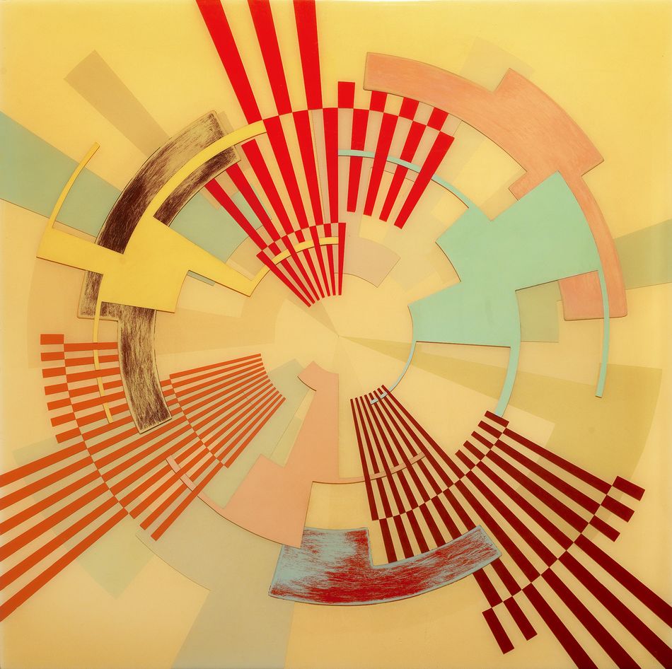 《中城》以鳥瞰角度將洛杉磯城市變成放射狀同心圓的景觀,漂浮的色塊增添無重力感,提供另一種空間觀看的視角。