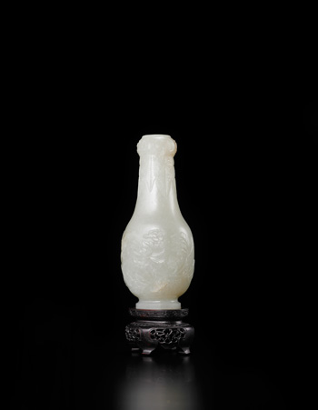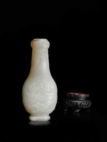 瓶整料白玉雕成,蒜頭口,直頸,溜肩,圓腹,腹下漸收,下承圈足。通體以淺浮雕技法裝飾,口緣外飾如意紋,頸壁上端飾高低交錯的蕉葉紋,腹壁浮雕折枝牡丹紋。全器造型優美,雕工細膩,是案頭陳設不可或缺的珍玩。