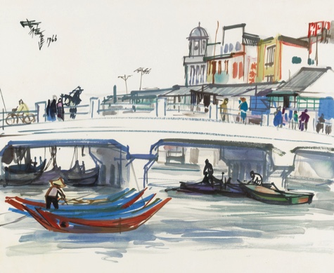 《基隆風景》創作於席德進甫旅歐歸來後,他曾在海天畫廊舉辦過歸國的講座,當時在現場更是播放著巴黎時期所拍攝的幻燈片。此幅作品為海天畫廊陳靜曾夫人所收藏,直接得自於藝術家本人。此時期的席德進開始捕捉台灣鄉土情懷,他以舒暢筆調,一氣呵成地掌握住大塊面主調色彩,再以強烈線條勾勒前景人物,造形簡潔有力,為席德進經典之筆法。他深耕人文與自然風貌,傳達詩意、豪情與對土地情感闡揚,以生命揮灑出最雋永之台灣風景。
