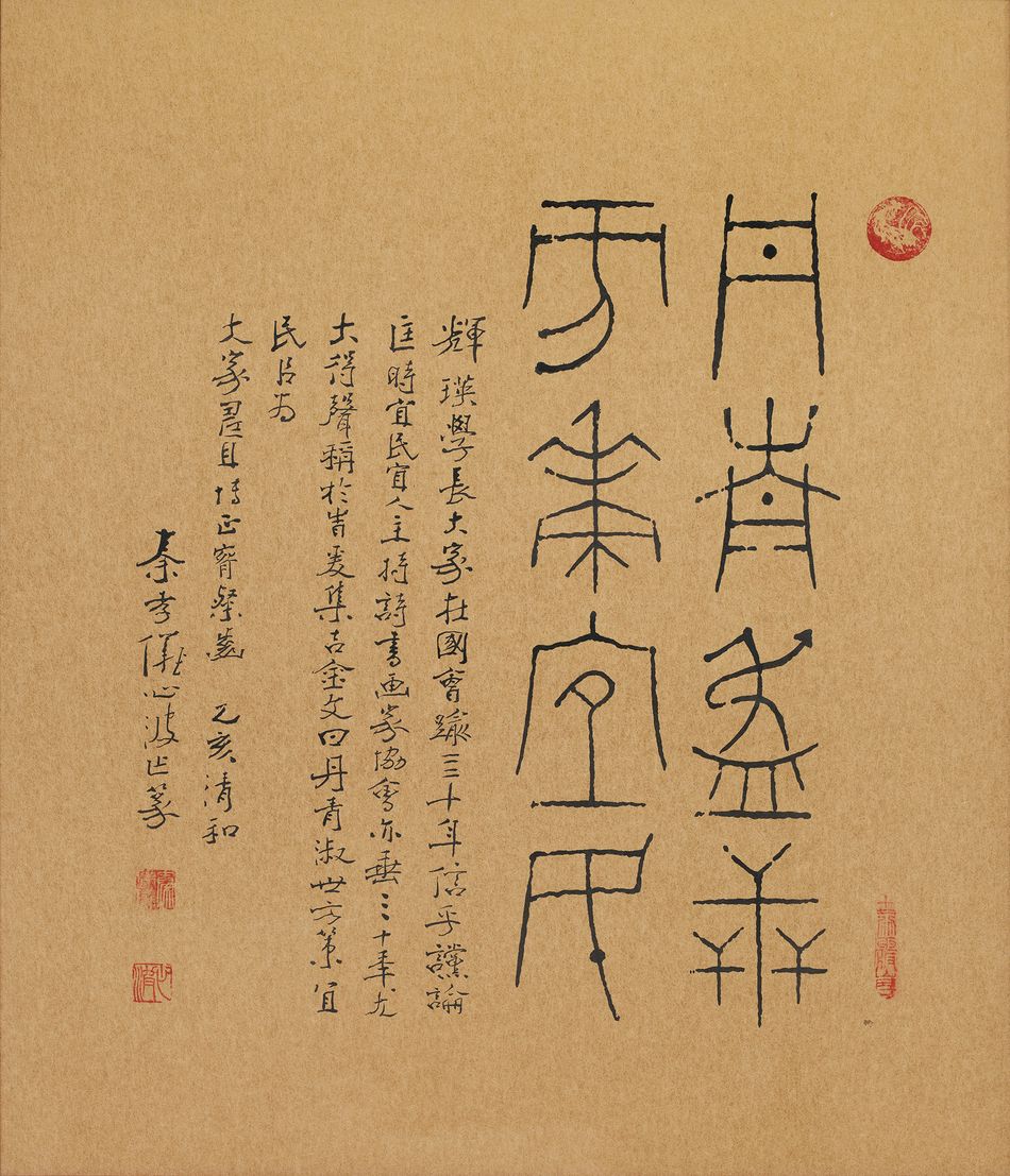 款識:輝瑛學長大家在國會踰三十年,信乎讜論,匡時宜民宜人,主持詩書畫家協會亦垂三十年,尤大得聲稱於青爰集古金文曰:丹青淑世,方策宜民。以為大家壽且博正腕粲齒。乙亥清和,秦孝儀心波作篆。