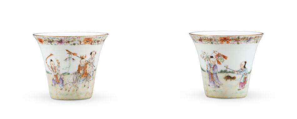 19世紀 粉彩嬰戲圖盃《麟趾呈祥》款 一對
